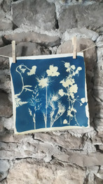 Le cyanotype est un procédé photographique ancien qui date du XIX -ème siècle. C'est la réaction de 2 composés chimiques, le citrate d'ammonium ferrique et du ferricyanure de potassium au soleil qui provoque le négatif des objets posés sur une feuille ou un tissu.