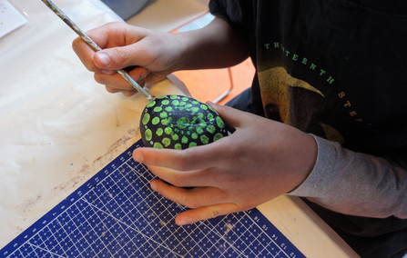 Atelier créatif zen pour la création de mandalas peints sur des galets. La précision des points, la forme arrondie et répétitive prêtent à la concentration et nous mettent dans un état méditatif. Chez les adolescents de cet atelier DIY en Rhône-Alpes à la médiathèque Jean Prévost de Bron, la pratique a été calme et studieuse. Tout le monde était détendu.