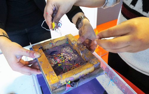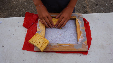 Une fois les explications données et un premier exemple, les enfants dès le CP (6 ans) peuvent participer à l'atelier en toute autonomie et fabriquer autant de papier qu'ils le souhaitent.